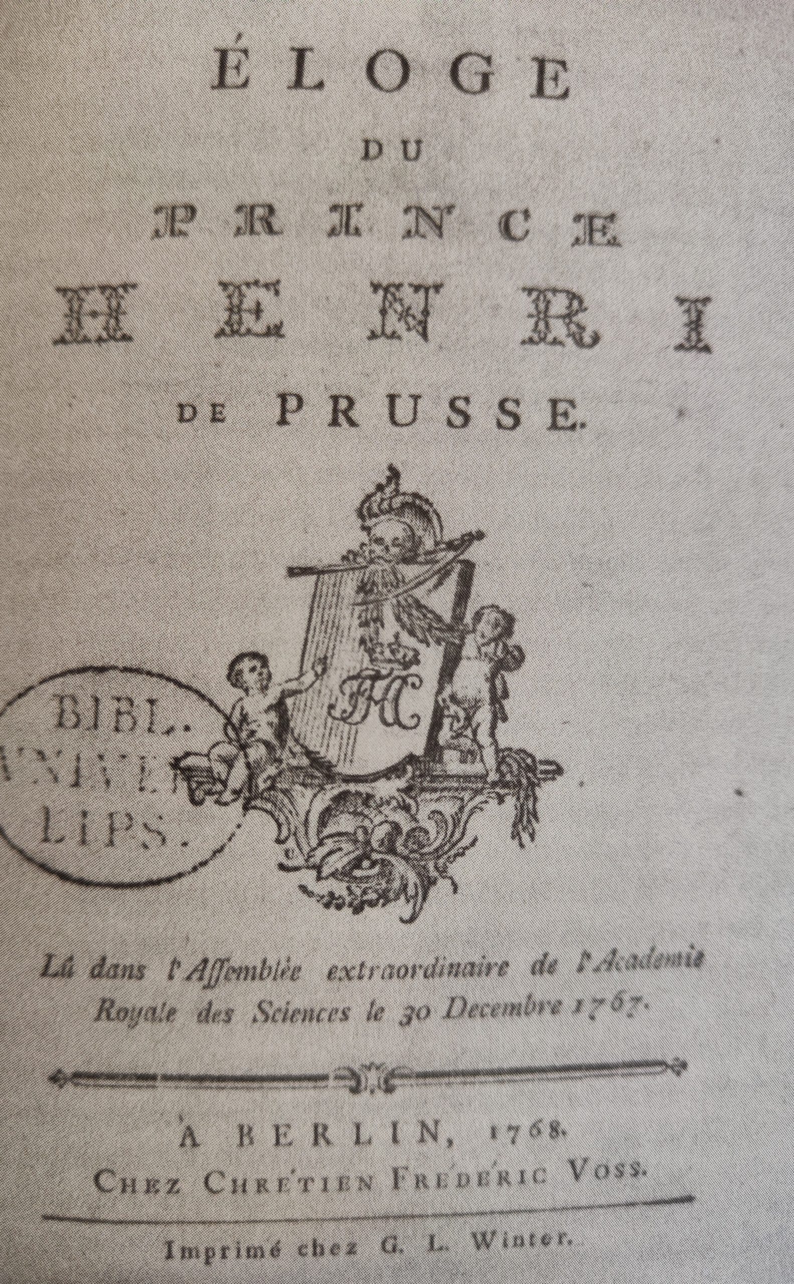 Gedenkrede für den Lieblingsneffen: Éloge du Prince Henri de Prusse von Friedrich II., Titelbild der französischen Erstausgabe von 1767